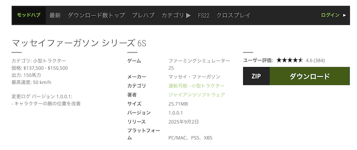 ダウンロード完了後、取得したMODファイルを『Farming Simulator 25』のインストール先ディレクトリに配置、または既存ファイルとの置き換えを行うことでMODが動作します。