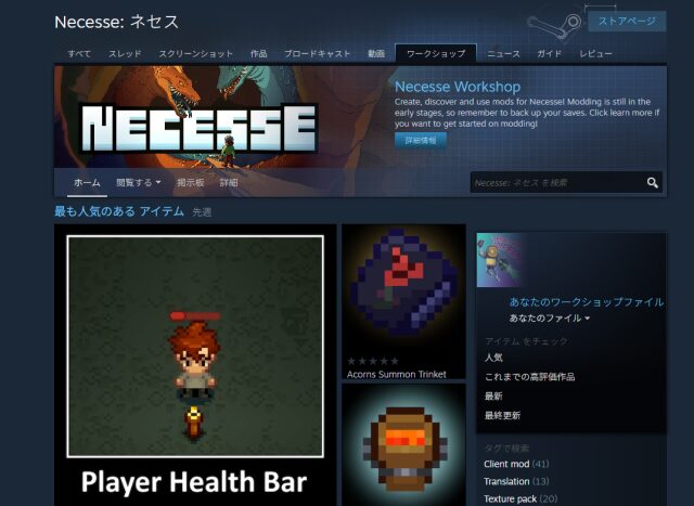 Steamクライアントを起動し、「コミュニティ」タブから『ネセス』のワークショップページにアクセスします。