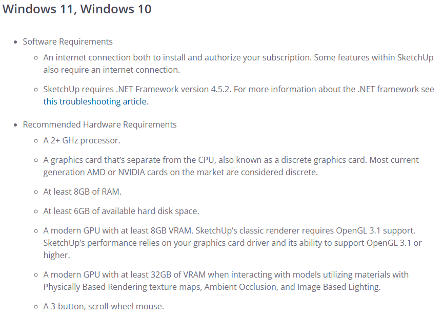 SketchUpの公式が提示している推奨環境では、Windows 10または11が動作するマシンで、CPUは2GHz以上の処理能力、メモリは8GB以上を搭載していることが基準として示されています。